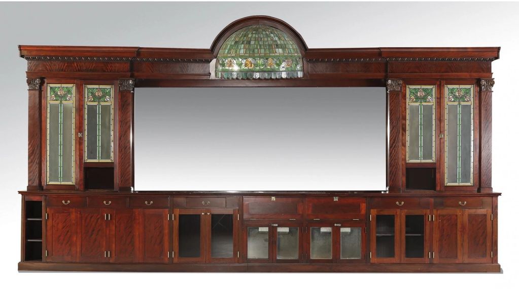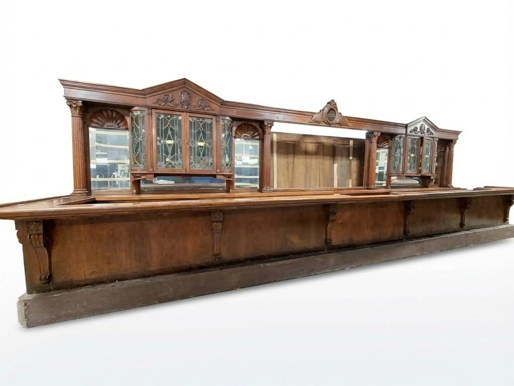 Antique Brunswick 22' Back Bar with Leaded Stained Glass Features. 12' Tall.
